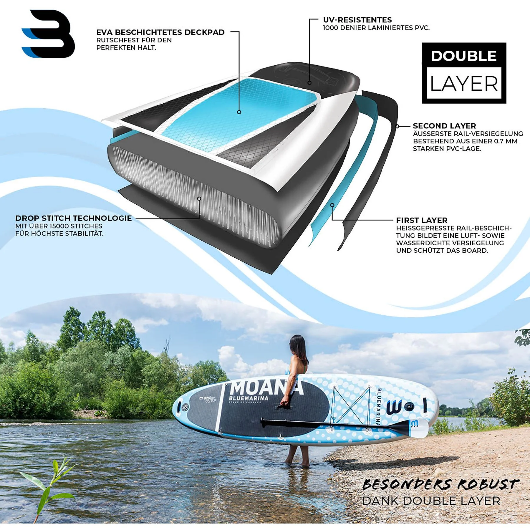 - Double Layer & Drop Stitch: Heißgepresste, luft- und wasserdichte Rails plus zweite 0,7 mm PVC-Schicht sowie mehr als 15.000 Fäden zwischen Ober- und Unterseite sorgen für hohe Steifigkeit und Langlebigkeit.