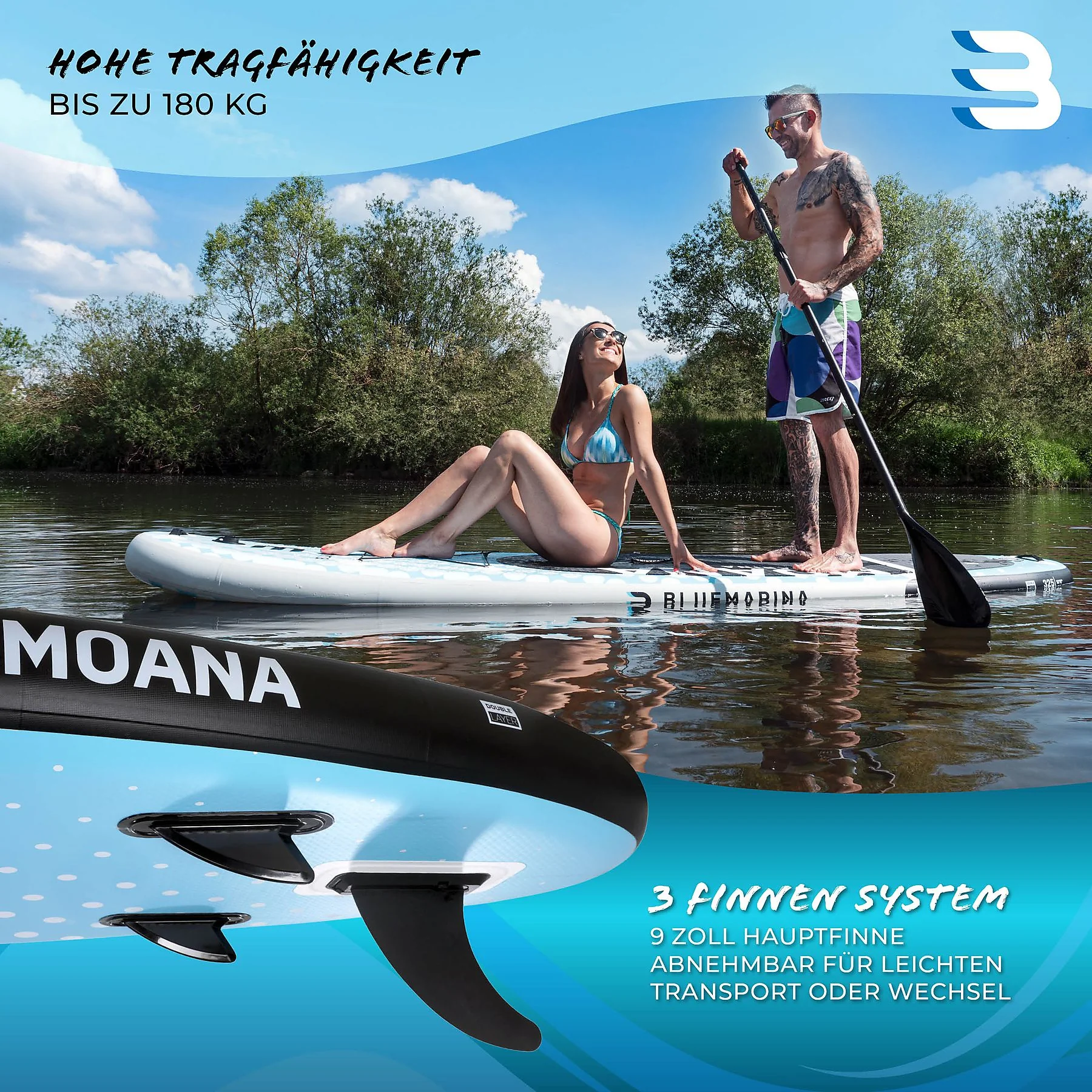 Das Bluemarina Stand Up Paddle Board Moana 2022 ist ein aufblasbares SUP für Freizeit, Training und Touren. Es kombiniert ein robustes Double-Layer-Material mit Drop Stitch Technologie und bietet damit die Steifigkeit eines Hartboards. Dank Rocker-Profil und 3-Finnen-System bleibt das Board stabil und gut manövrierbar – auf Seen, Flüssen und bei wechselndem Wellengang. Je nach Größe trägt es bis zu 180 kg und ermöglicht so Fahrten allein, zu zweit oder mit zusätzlichem Gepäck im vorgesehenen Gepäcknetz.