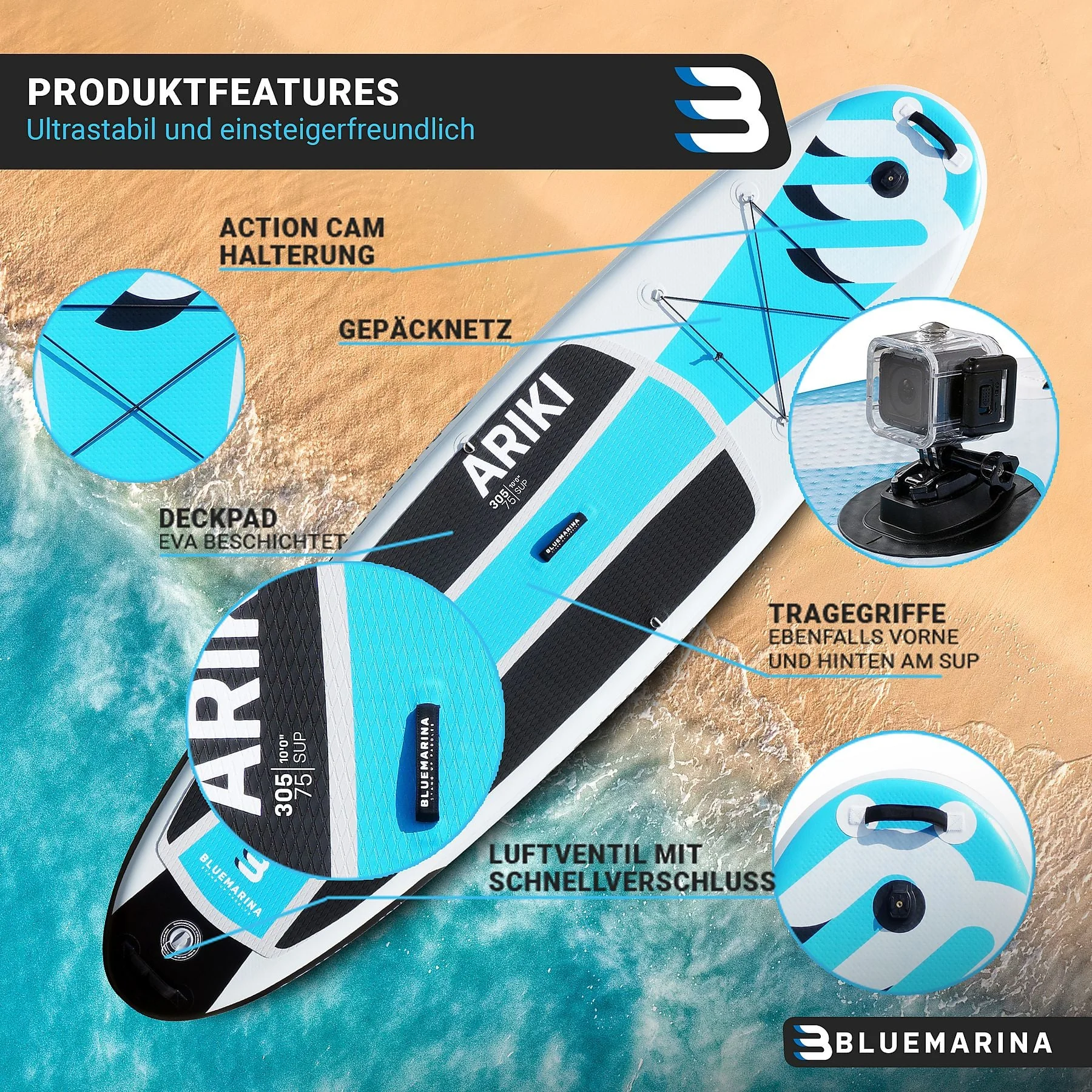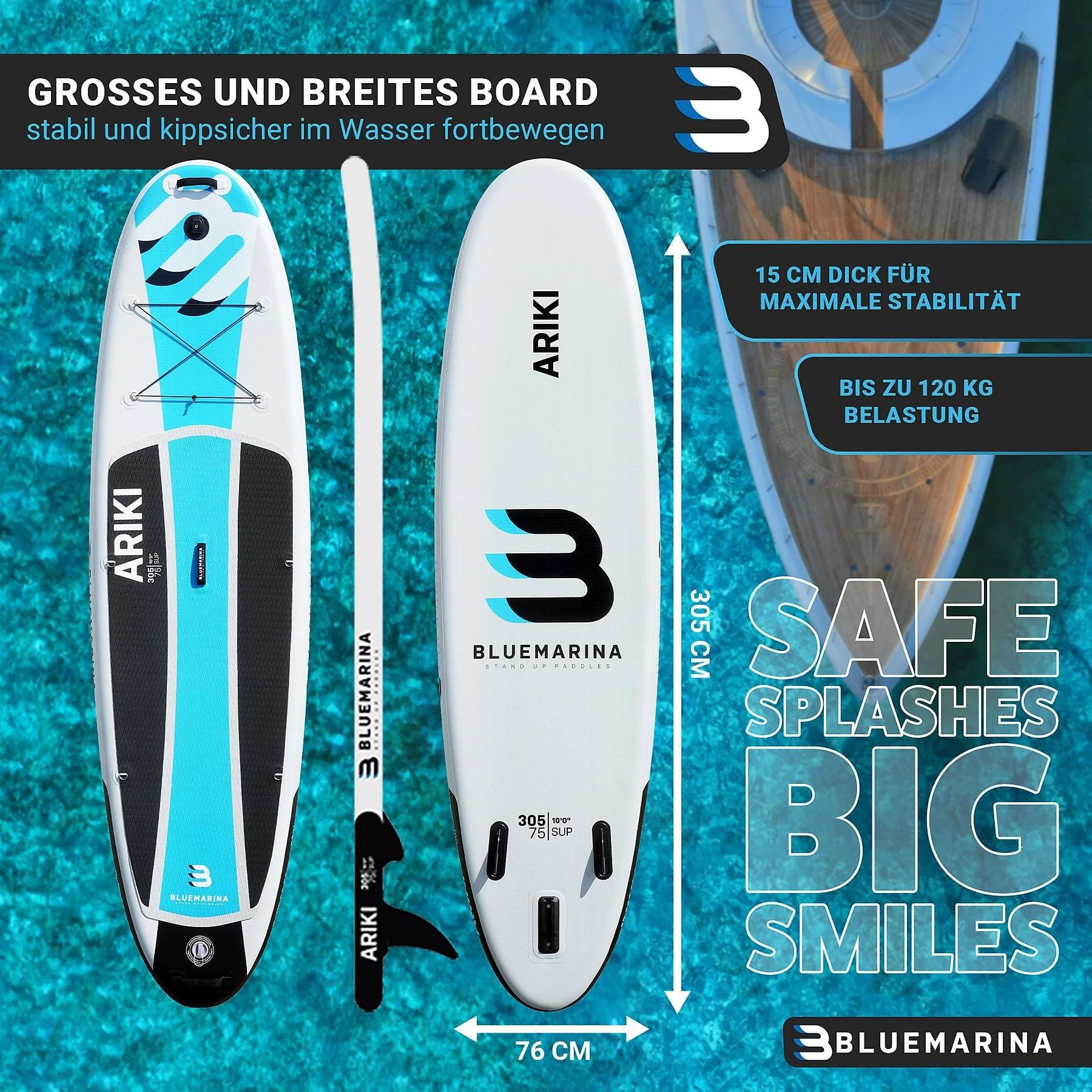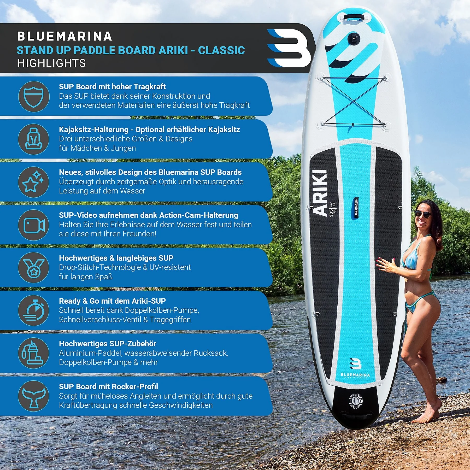 Produktinformationen "BLUEMARINA SUP Board Ariki 305x76x15 cm weiß blau schwarz"