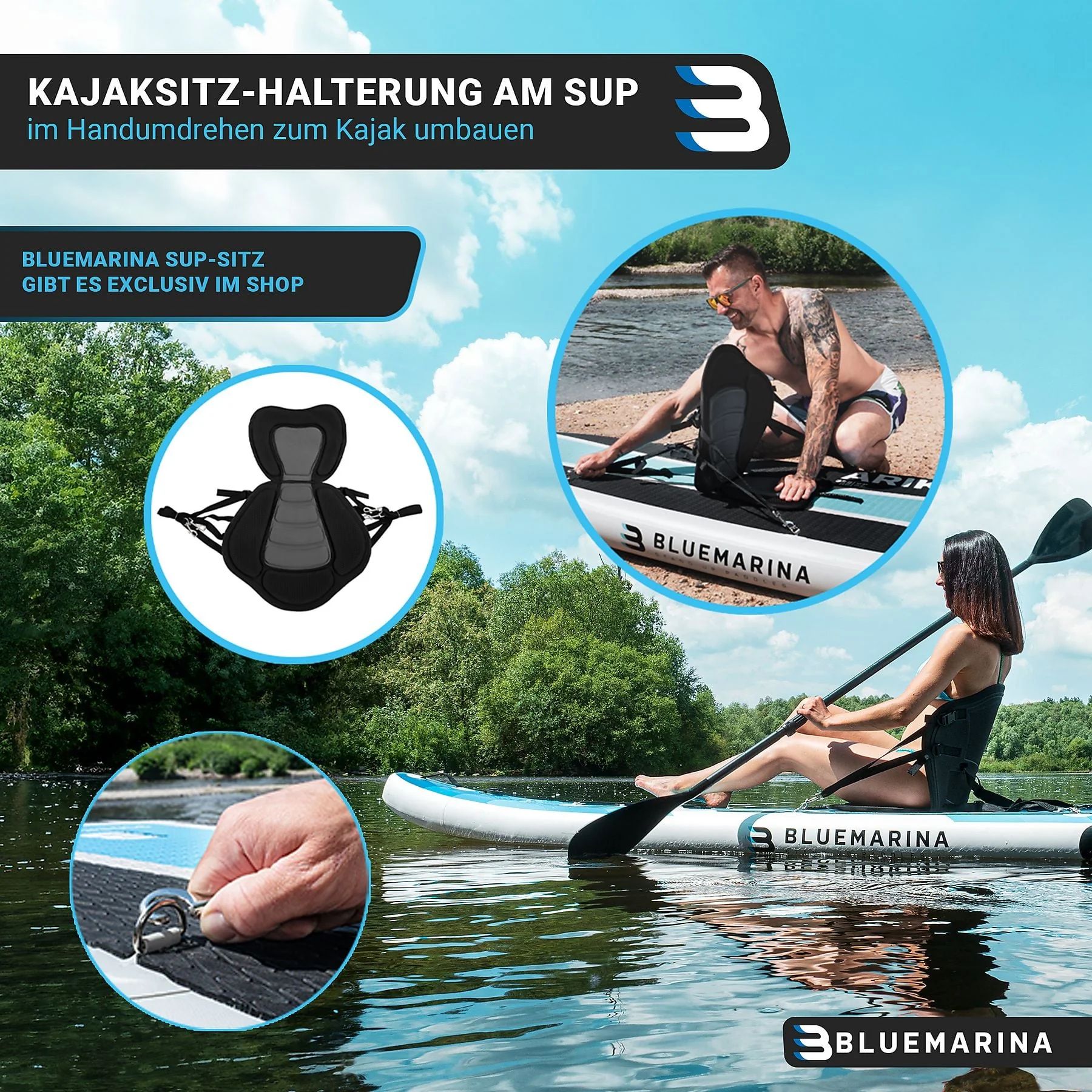 - Kajaksitz-Halterung: D-Ringe zur Befestigung eines optional erhältlichen Kajaksitzes für eine alternative Sitzposition.