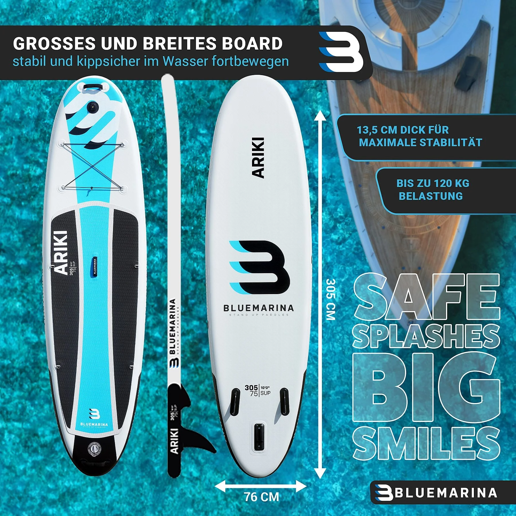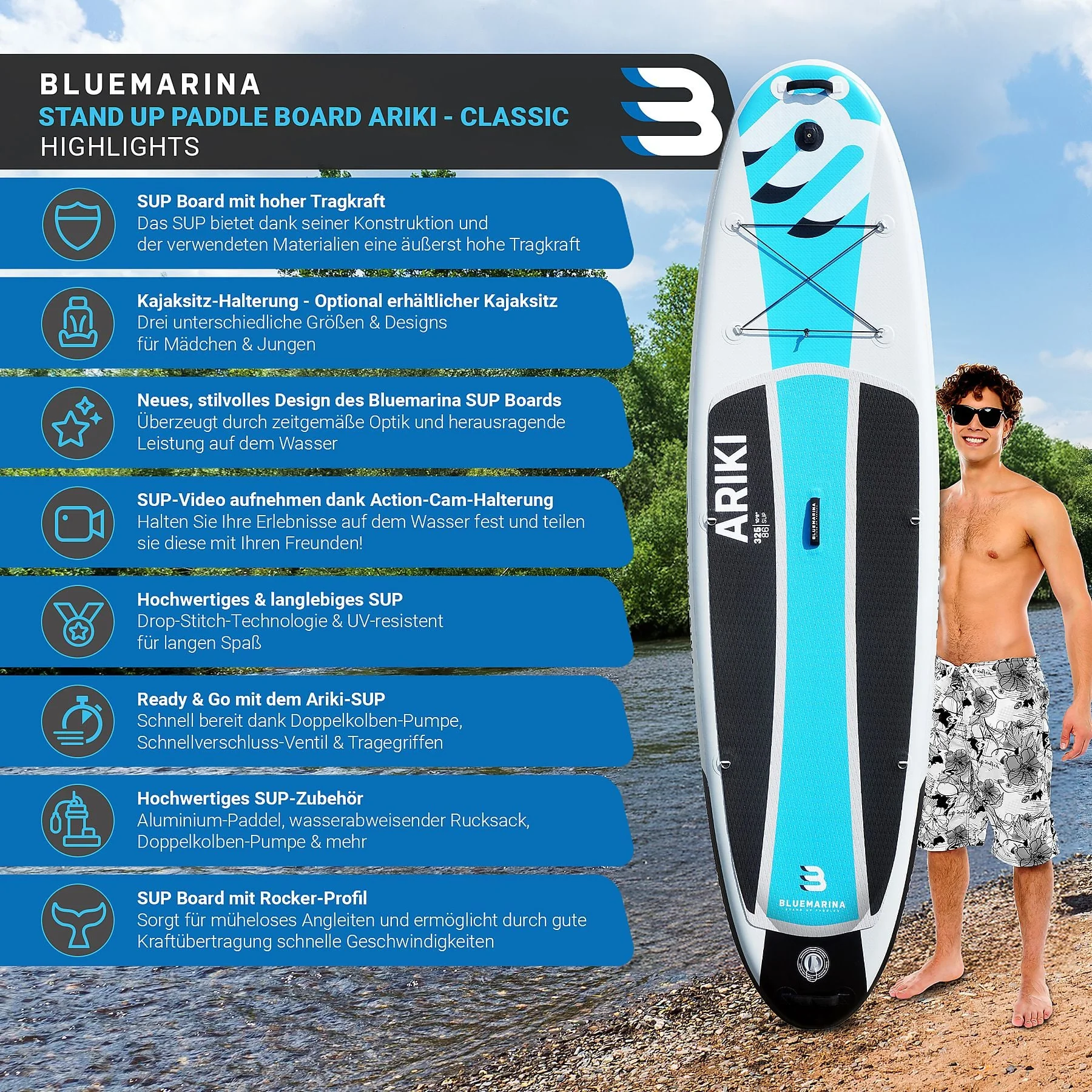 | Lieferumfang | SUP Board, Doppelhubkolbenpumpe, Paddel, Tragerucksack, Reparaturset, Bedienungsanleitung |