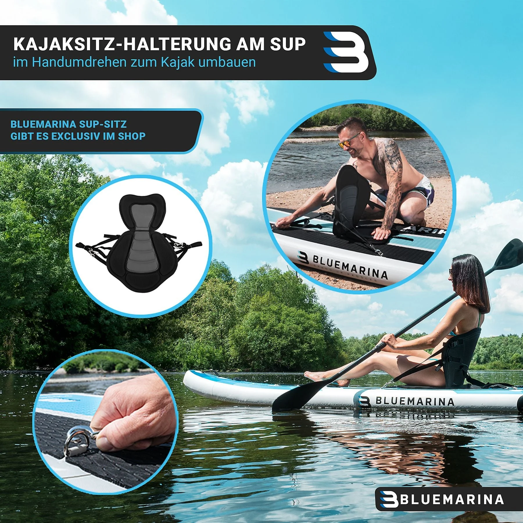 - D-Ringe für Kajaksitz – optional erhältlichen Sitz anbringen und das SUP zum Kajak umbauen.