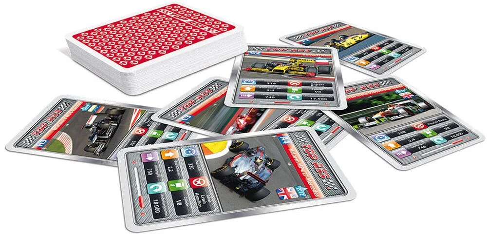 Erlebe die Faszination der Königsklasse des Motorsports mit dem TOP ASS Quartett „Formel 1“ von Cartamundi. Auf 33 spannenden Karten findest du wissenswerte Daten, Fakten und technische Details zu den schnellsten Rennwagen der Welt – von Motorleistung über Geschwindigkeit bis zum Gewicht.
