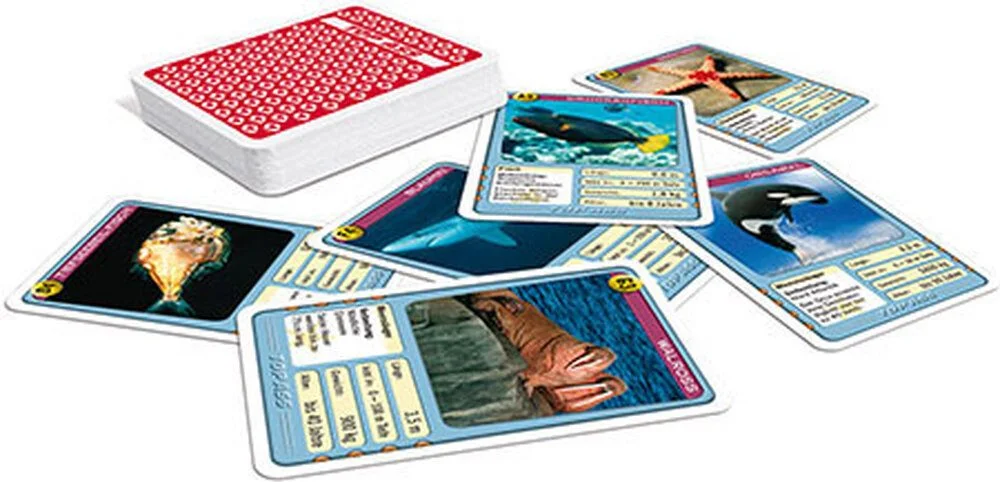 Tauche ein in die Tiefen der Ozeane mit dem TOP ASS Quartett „Meerestiere“ von Cartamundi. Hier erfährst du spannende Fakten über Wale, Delfine, Fische, Reptilien und andere Meeresbewohner – von der Größe und dem Gewicht bis hin zum Alter und Lebensraum.