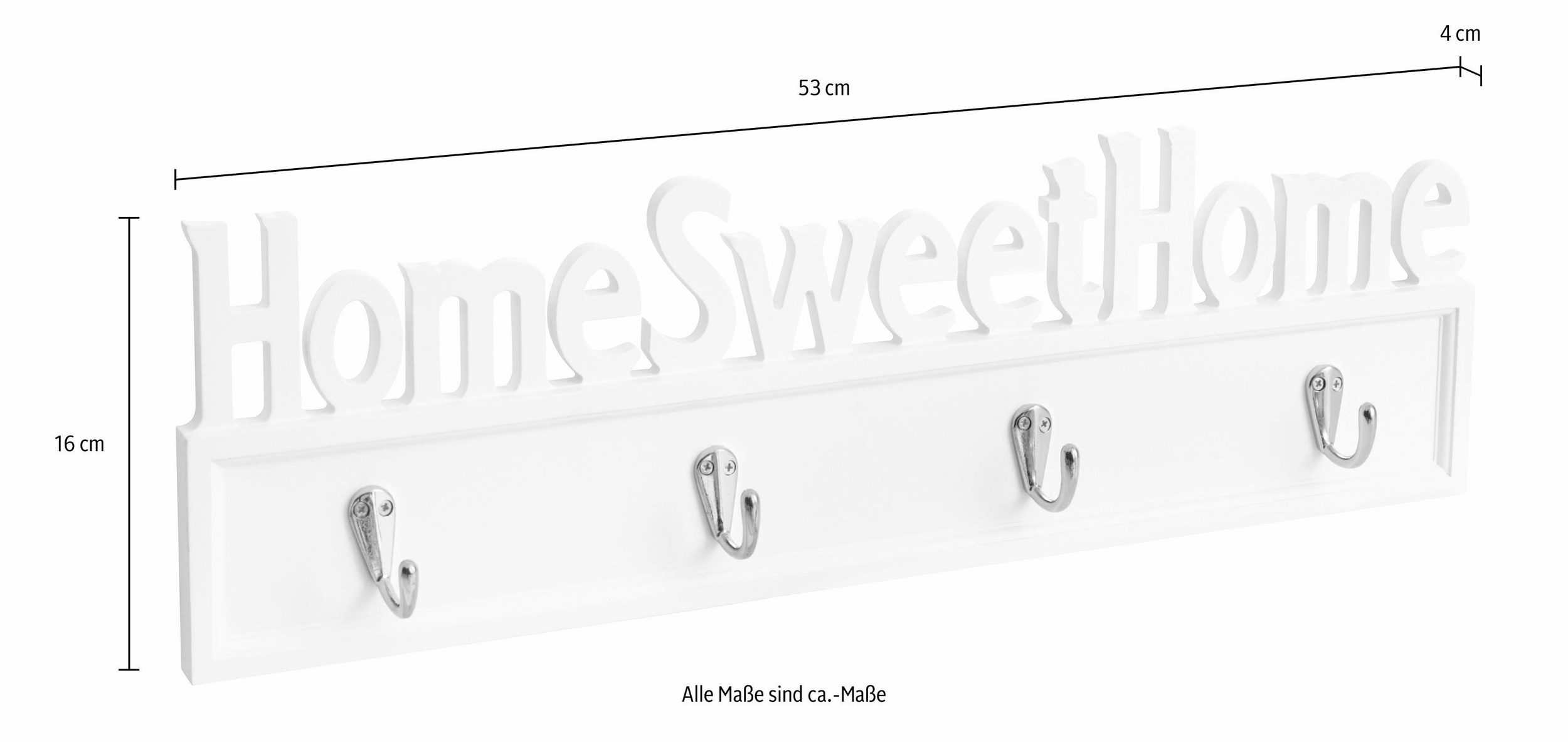 Highlights: Moderner Schriftzug „Home Sweet Home“, 4 stabile Metall-Haken, FSC®-zertifiziert, ideal für Eingangsbereich und Diele.