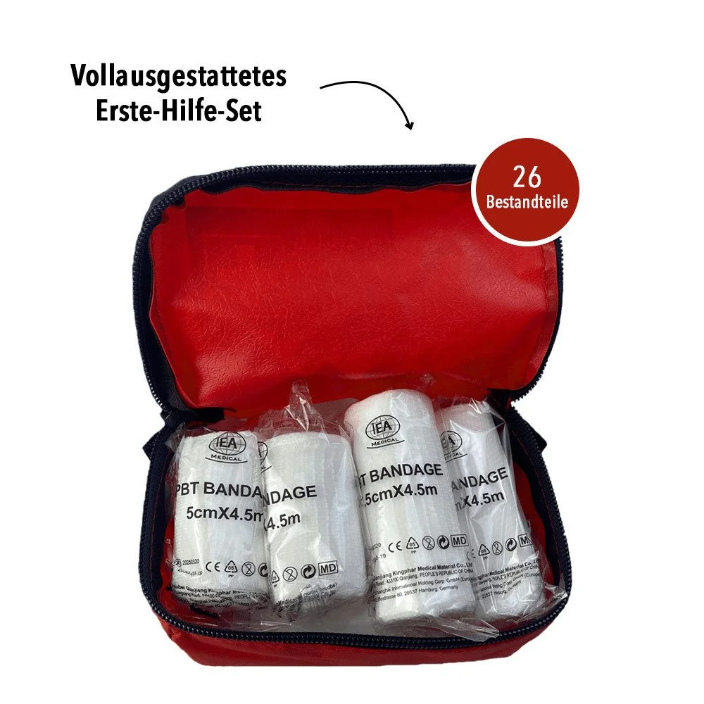 | Im Paket | 1 × Erste-Hilfe-Set mit 26 Teilen, inkl. Pflaster, Mull, Kompressen, Reinigungstücher, Schere, Handschuhe, Zeckenzange, Karabinerhaken und Anleitung |