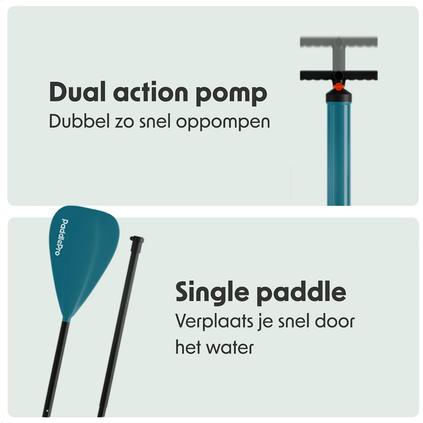 - Materialmix für Alltagstauglichkeit: hochwertiges PVC und EVA-Schaum am Board, Aluminium-Paddel, robuster Oxford-Rucksack.